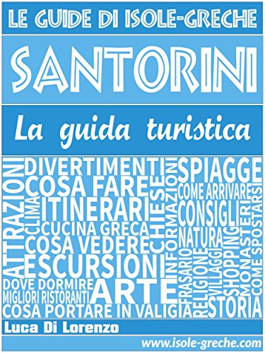 La guida turistica di Santorini, la regina delle Cicladi, una delle isole più belle e famose della Grecia. Scopri tutti i consigli per risparmiare; la sua storia avvincente tra il mito di Atlantide e la devastante eruzione che la generò e tutti gli altri avvenimanti; la mappa dell'isola; le spiagge di Santorini, dalla celebre Red Beach a quelle meno conosciute e meno affollate; i luoghi di interesse storico/artistico, le suggestive chiese e case dell'architettura tipica delle Cicladi; i musei, le gallerie d'arte e i siti archeologici da visitare, tra tutti la splendida Città Preistorica di Akrotiri, nota come la "Pompei greca"; i villaggi tradizionali, la musica e i balli tradizionali greci; gli itinerari e tutte le escursioni da fare; quali sono le zone migliori di Santorini dove alloggiare; i negozi dove fare shopping; come arrivare e come spostarsi; i prodotti tipici dell'isola, tutti i piatti della cucina greca da assaggiare e i migliori ristoranti dove provarli; dove ammirare i celebri tramonti di Santorini; i bar e le discoteche della vita notturna.Visita il sito ISOLE-GRECHE.com per scaricare l'anteprima più dettagliata in modo da conoscere tutti gli argomenti trattati nella guida di Santorini.